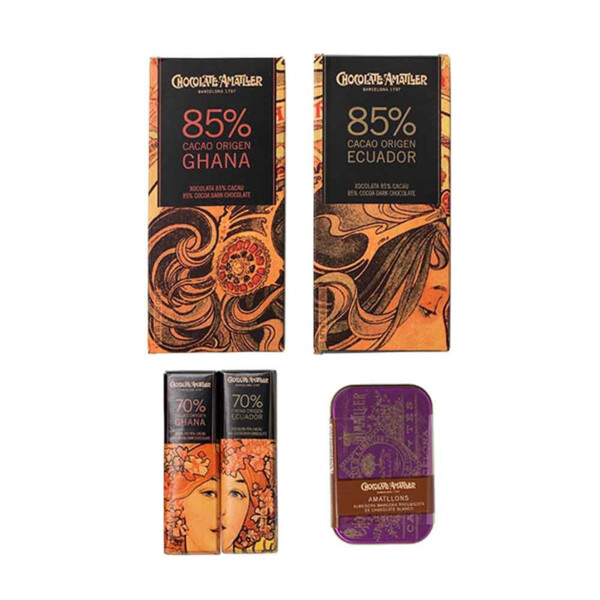 Pack con cinco tipos de chocolates de Amatller, si te gusta el cacao este es tu regalo ideal, la cesta va envuelta con material transparente dejando ver todo el contenido acabado con un lazo decorativo de la propia marca Amatller. El diseño está inspirado en infografías gráficas modernistas convirtiendo esta cesta de chocolate en el regalo ideal para los amantes del buen cacao. 100% recomendado.