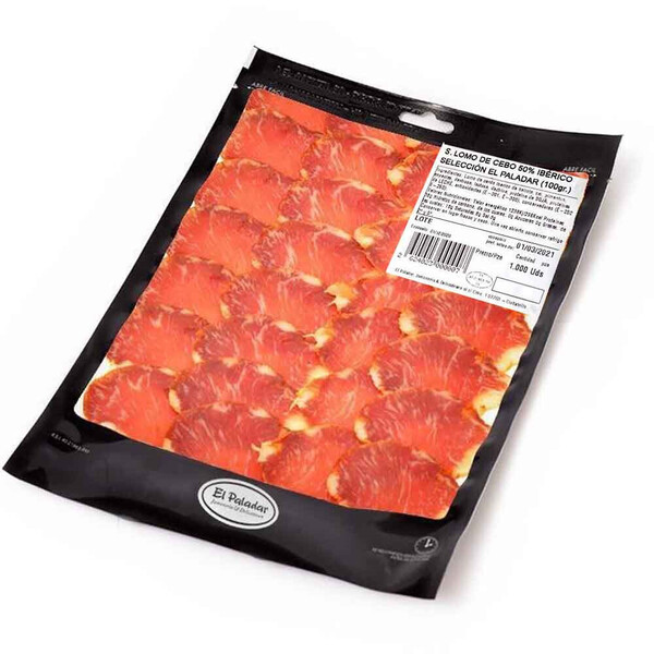 Lomo iberico al 50 % di razza iberica, confezionato sottovuoto in porzioni da 100 g, affettato a mano dai salumieri di El Paladar, stagionato con cura per una consistenza e sapore raffinati