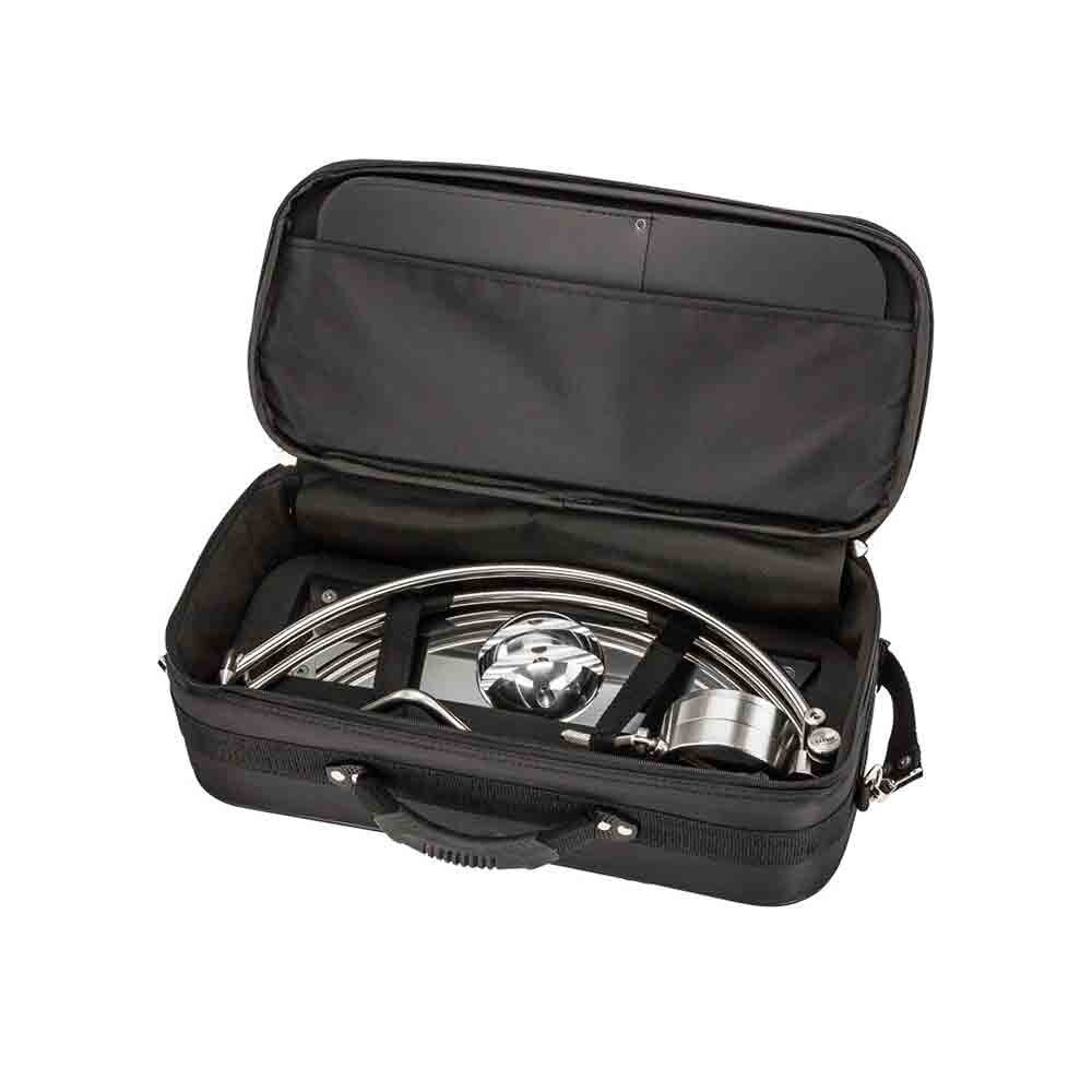 • Dotata di due maniglie—una a tracolla e una per il trasporto a mano—con piedini in metallo per proteggere le superfici.